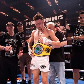 Tait was making the first defence of his title against Evans, the experienced amateur with over 120 fights. Tait using his very unorthodox southpaw style, with his hands very low and coming in with lead right looping uppercuts, followed up by straight right hands. Very often he would land, but Evans was experienced enough to use his ring craft to evade some of the heavy shots. Evans showed his toughness, and as the rounds went on Tait become more precise as Evans defence and movement started to slow. In round 7, Tait landed a straight left that opened a nasty cut over Evans’s right eye. Dr James Conville has a look at the cut at the end of the round and decided to stop the fight. Tait progresses to 10-0 and retains the Australasian Lightweight title. Scores at the time of the stoppage were 60-53 x2 and 59-54 all for Tait.